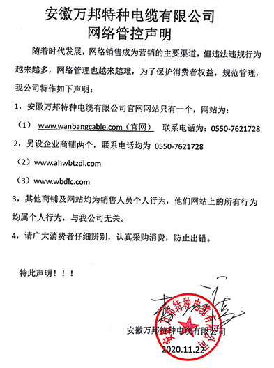 鄭重聲明:安徽萬邦特種電纜有限公司官方網站為:www_wanbangcable_com.66asphase.cn,除此之外無任何子網站或合作網站,其余均為假冒偽劣。電話:0550-7621728 13485756353 地 址:安徽省天長市滁州高新技術產業開發區經四路29號